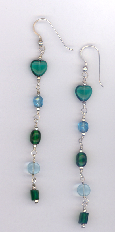 Okay, these baby blue swirled lampwork glass beads have been paired with Czech crystals and silver metal beads. The additional loads of charms, even a pewter flower and tiny heart, are just for fun. I love how these handmade beaded earrings turned out..perfect with a pair of jeans and a white blouse.